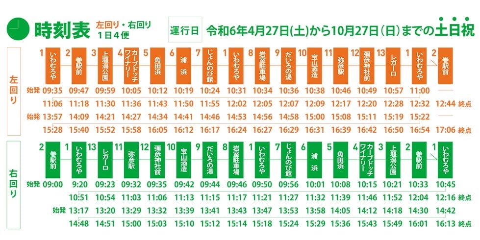 運行スケジュールは、右回りコースが観光施設「いわむろや」始発~JR「巻駅」折り返し、「いわむろや」に戻る。左回りコースが「巻駅」始発~「いわむろや」折り返し、「巻駅」に戻る。各コースは1日2往復(計4往復)運行。