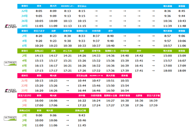申し込みは、京王電鉄の鉄道営業部 営業管理所(団体受付)宛に希望日、希望列車、乗車人数、企画内容をメール(koshitsuplan@keio.co.jp)で送信します。受付は乗車日の2カ月から可能で、乗車日の2週間前までに内容確定が条件。「京王ライナー」及び「Mt.TAKAO号」の時刻表は京王ライナー公式ホームページで確認可能。