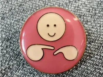 新バッジは、ピンクの下地に白抜きで、指と指が交差する手話表現をハート形に見立てたイラストで「手と手の交流」を表現し、「思いやり」「やさしさ」の象徴としてデザイン。